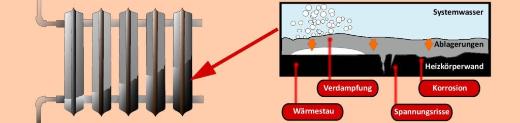 Am häufigsten äussert sich eine Verschlammung der Heizanlage durch Störungen in der Hydraulik. Verschlammungen in Heizungsanlagen sind die Ursache für weitreichende Störungen im gesamten Heizsystem: reduzierte Heizleistungen, ein erhöhter Verschleiss bei Pumpen und Ventilen und somit auch eine Verkürzung der Lebensdauer einzelner Geräte und des gesamten Systems. Die Schlamm- und Korrosionsprodukte setzen sich in Heizanlagen an den tiefsten Punkten im System ab. Diese Ablagerungen werden, da sie nicht mehr transportiert werden, immer größer. Dies kann bis zum vollständigen Verschluss ganzer Leitungen und Radiatoren führen. Zudem werden die Thermostat-Ventile, Regulierungsgeräte und Messsysteme blockiert.