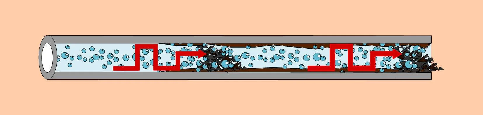 Unser patentiertes Impulsjet-Reinigungsgerät wurde speziell für das Reinigen von Heizungsanlagen sowie Deckenheizungsanlagen entwickelt. Beim Impulsjet-Reinigungsverfahren erzeugen Impulse einen hydrodynamischen Effekt der Kompression und der Entladung (einen negativen Druckbereich im fliessenden Wasser). Dadurch werden auch feste Ablagerungen von der Oberfläche schonend gelöst. Durch diesen hydrodynamischen Effekt wird die Reinigungswirkung wesentlich effizienter. Impulsdauer und Impulsintervall sind stufenlos regulierbar, wodurch auch sehr kleine Rohre optimal durchgereinigt werden können. Durch eine Kombination verschiedener Reinigungsmöglichkeiten wird eine effiziente und zeitsparende Reinigung aller marktüblichen Heizsysteme ermöglicht.