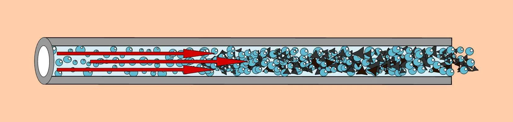 Herkömmliches Spülen ohne Luftbeimischung – das Wasser überfliesst die festen Ablagerungen.